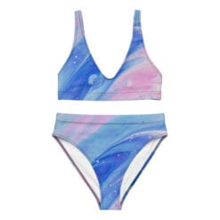 Shop the Galaxy Swirl Recycled High-Waisted Bikini Set. Eco-friendly, comfy, double-layered swimwear with removable pads and a flattering fit. Perfect for beach & pool days.